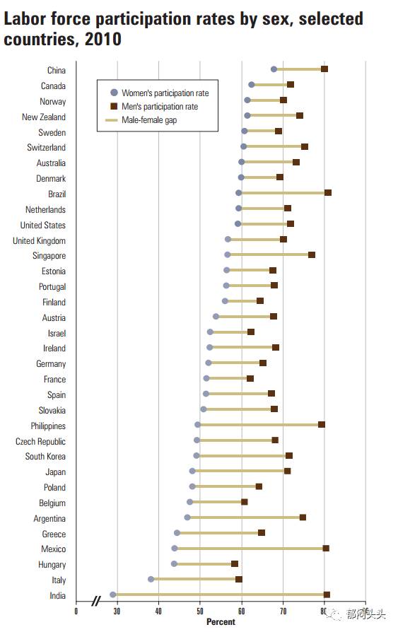 中国男人出来养家的意愿不算世界仅有,至少巴西、菲律宾,印度都能和中国媲美。主要的差别就在于女性的劳动参与率。中国女人劳动参与率虽然赶不上中国男人,但是居然赶得上大多数发达国家的男人,比如美国,日本,芬兰,法国,西班牙。也远远超越相邻的日本、韩国。