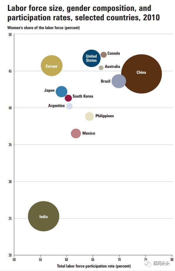圆的面积是劳动力总量,横轴为女性劳动参与率: