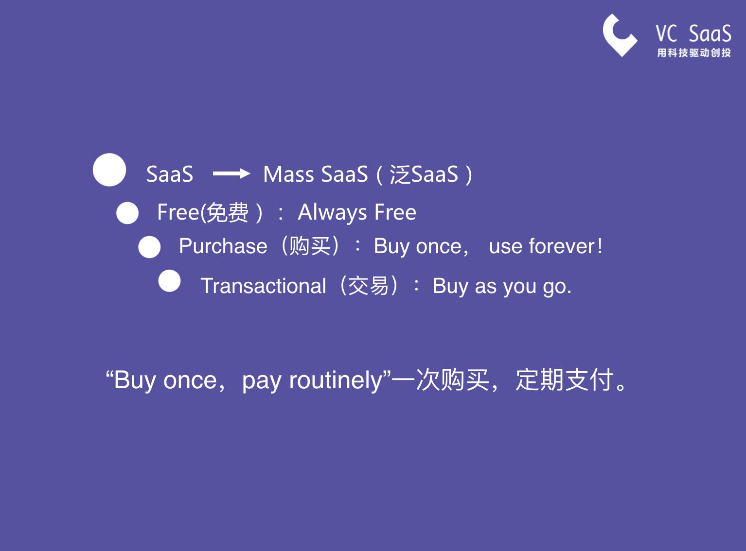 而现在针对把企业客户的SaaS服务在消费领域的延伸叫做Mass SaaS“泛SaaS”;这个模式会演变成新模式“Buy once,pay routinely”——一次购买,定期支付。