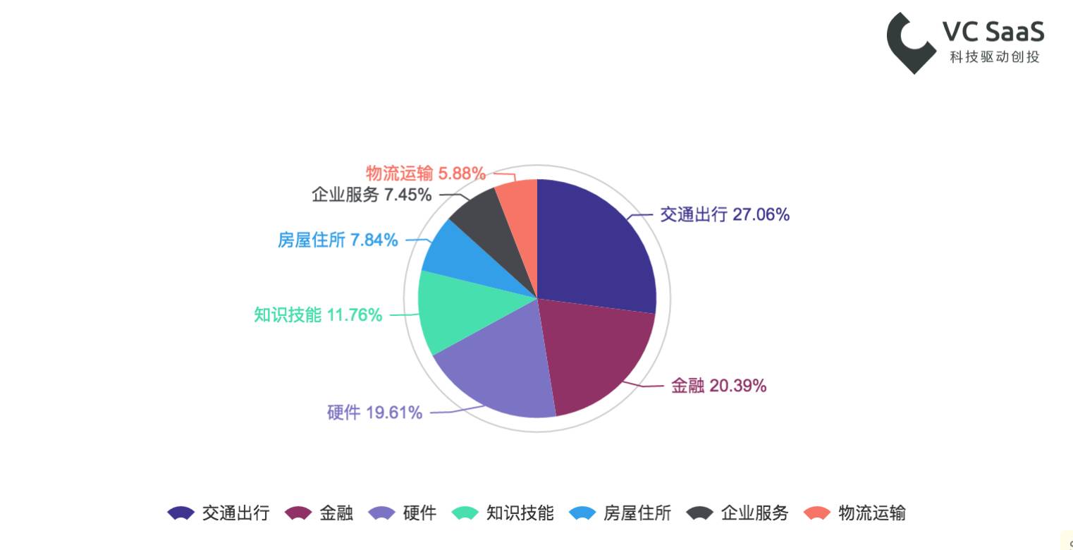 在这些企业当中,我们发现交通出行、金融、硬件这三个领域的创业项目数量最多。分别占比为27.06%、20.39%、19.61%。说明这三个领域目前竞争最为激烈,同时也说明其他领域还具有很大的潜力。