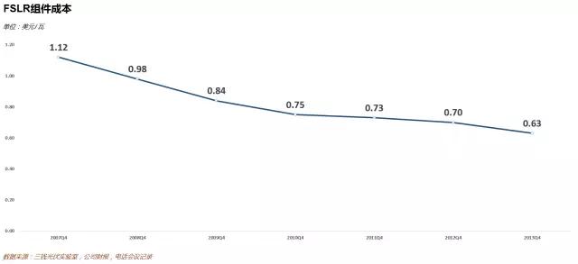 2007年第四季度的时候,FSLR的成本是1.12美元/瓦,而到了2013年第四季度,这个数字变成了0.63美元/瓦(出于“商业机密”的原因,FSLR往后不再公布具体成本)。