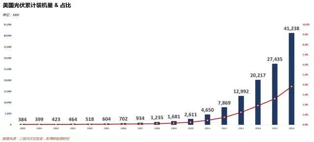 时至今日,美国的光伏累计装机量已超过40GW,占全国总装机量的4%,在新能源中仅低于风电和水电。