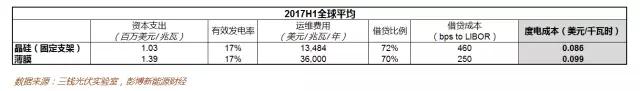 然而,只看组件成本并不全面,电站业主们作为FSLR的顾客,最终看的是电站发电的度电成本:更低的度电成本,代表着更高的收益率。而在2017年上半年,薄膜的全球平均度电成本为0.099美元/千瓦时,晶硅的只需要0.086美元/千万时。