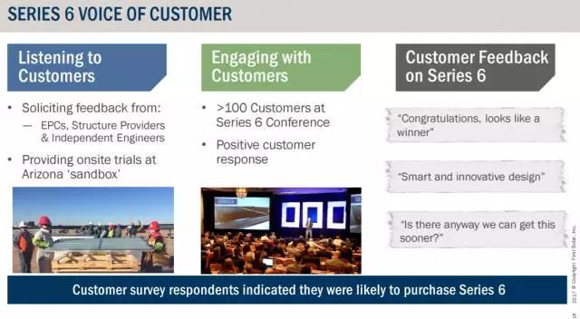 如果成本按照旧有的路线前进,FSLR可能这辈子都走不出美国了。管理层在意识到这一点之后,便于去年11月宣布,跳过没有竞争力的第五代产品(Series 5),直接将生产线升级到成本更有优势的第六代产品(Series 6)。