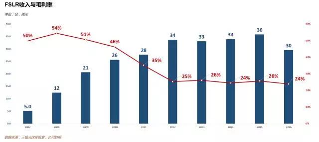 在与标普500指数(上图橙色线)的对比中可以发现,后来FSLR股价恢复的力度并没有赶上市场平均水平,这是因为当时光伏的暴利吸引了无数新玩家,尤其是来自中国的光伏组件厂商,整个行业开始进入低价恶性竞争的阶段,这一点从FSLR急剧收缩的毛利率即可看出。