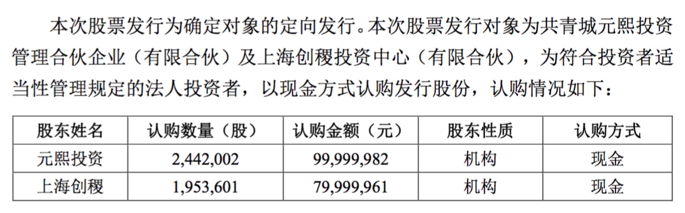 第二次为2017年5月26日披露的2017-028号方案,资方为元熙投资、上海创稷,定向发行价格为 40.95 元/股。