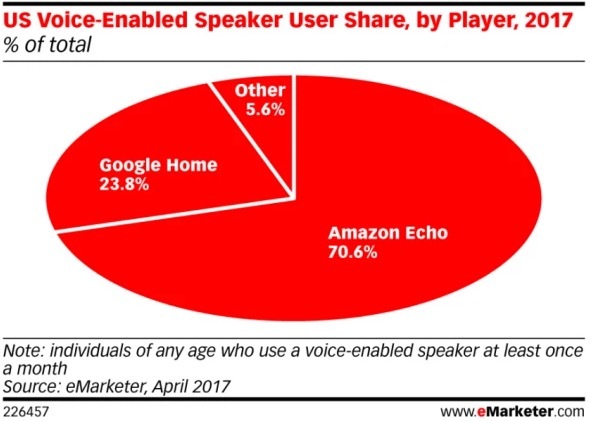 作为第一个吃到螃蟹的Echo,eMarketer数据显示,2017年Q1美国智能语音音箱市场中,Echo市场份额已达70.6%,Google Home以23.8%位列第二,其他厂商(包括苹果、Lenovo、LG、Harmon Kardon和Mattel)分食剩下的市场份额,为5.6%。