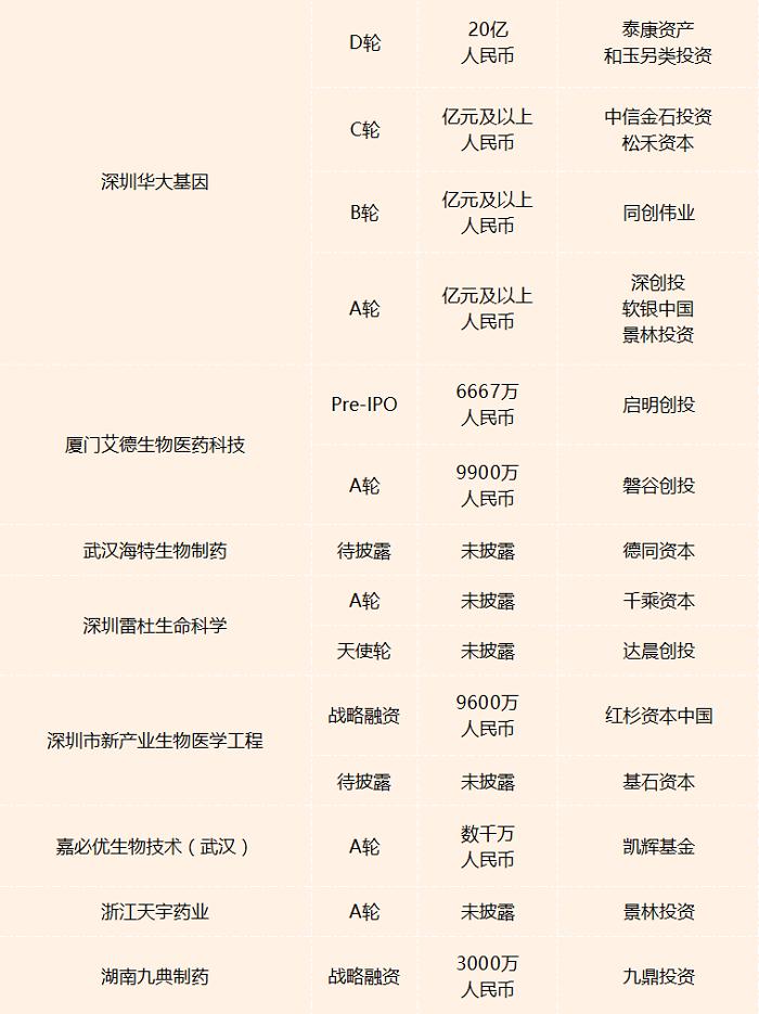 公开总融资额最大的当属深圳华大基因,仅D轮融资就有20亿人民币。此次上市拟募资17亿元,发行股票数量不低于4000万股,目前总估值约为153亿元。