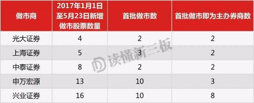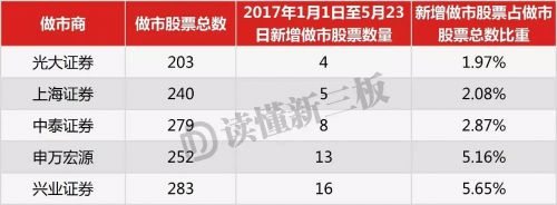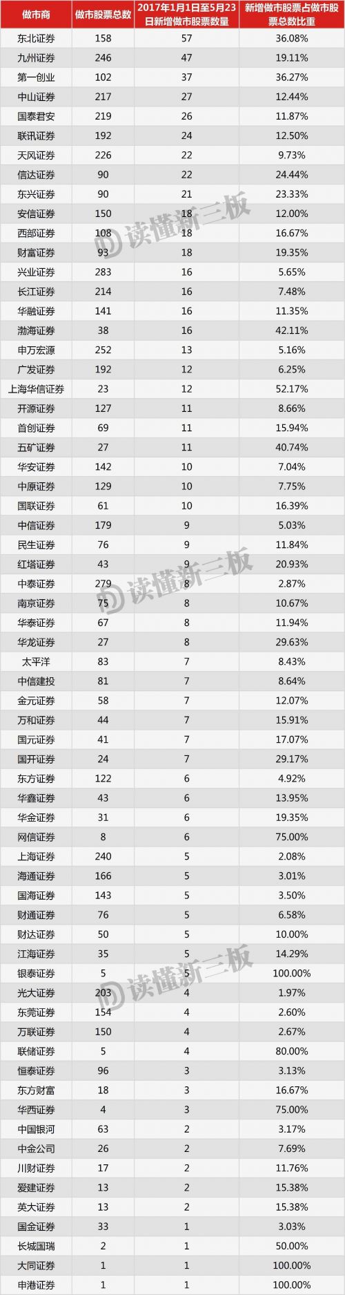 根据读懂新三板研究中心数据,从2017年1月1日至2017年5月23日,66家券商后续加入225家公司。为其提供做市服务。