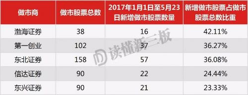 根据读懂新三板研究中心数据,2017年新增做市公司数量不少于15家,且占目前做市公司总数20%以上的做市商有5家,分别是渤海证券、第一创业、东北证券、信达证券和东兴证券。