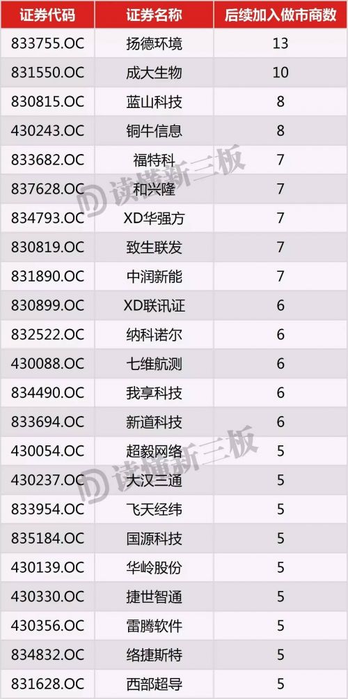 其中,有23家公司被5家以上的做市商“翻牌”。其中,最受做市商青睐的公司是扬德环境(833755.OC)、成大生物(831550.OC)、蓝山科技(830815.OC)和铜牛信息(430243.OC),分别有13家、10家、8家券商后续加入为其提供做市报价服务。