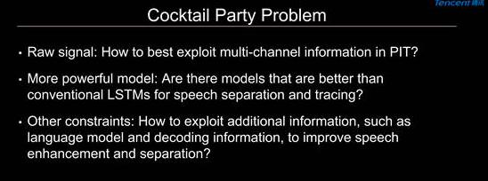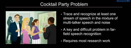 人在鸡尾酒会这样非常嘈杂的环境中能够把注意力集中在某一个人的声音上,屏蔽掉周围的说话声或噪音,非常好地听懂他/她要关注的那个人的说话声音。现在绝大部分的语音识别系统还没有这个能力。这个问题在近场麦克风并不明显,这是因为人声的能量对比噪声非常大,而在远场识别系统上,信噪比下降得很厉害,所以这个问题就变得非常突出,成为了一个非常关键、比较难解决的问题。