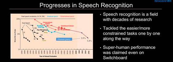 俞栋认为,虽然语音识别在过去几十年里取得了一定进步,如今机器也已经在电话聊天这样的任务上达到甚至超过人的识别水准,但是离真正的人与机器的自由交流还有一定差距。