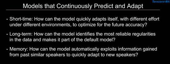 所以现在的问题是如何建造一个更好的模型,它能够持续地做预测和自适应。它需要的特点是什么呢?一个是它能够非常快地做Adaptation并优化接下来的期望识别率。另外它要能发现频度高的regularities并把这些变成default model的一部分,不需要再做adaptation。还有就是我们有没有办法把大类的自适应模型用更好的方式压缩在模型里面,使得adaptation可以直接从这些模型开始而不是default model。