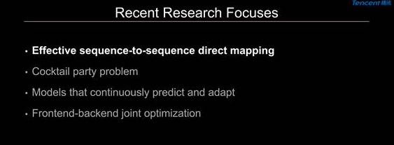 第四个研究前沿有关远场识别以及如何做前端和后端更好的联合优化。目前来讲,前端的信号处理技术一般只用到当前状态下的语音的信号信息,这些信息的利用主要靠对声学物理规律的把握并基于一定的假设。而机器学习的方法能利用很多的训练集里学到的信息来建模,但是它一般不是基于物理原理的,对当前帧信息的使用比较弱。所以我们有没有办法把这两种方法比较好地融合在一起,这是目前很多研究组织发力的一个方向。