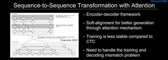 Attention 模型首先把输入的语音信号序列转换成一个中间层的序列表达,在这个中间层序列表达上面,能够融合上下文信息,然后就可以基于这个中间层的表达用一个专门的、基于递归神经网络的生成模型来生成转换后的词序列。这个方法在机器翻译里面现在成为了主流方案,但是在语音识别里面它还是一个非常不成熟的技术,它有目前有几个问题。