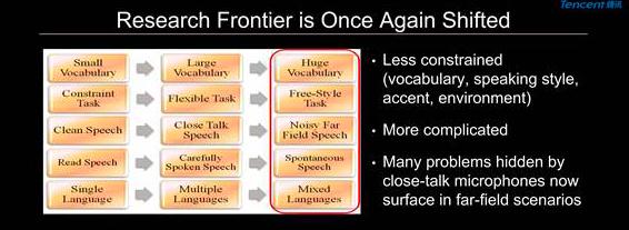 如今我们研究的语音识别问题越来越没有环境、说话风格、口音、词汇等限定(不像以前有非常多的限制),这极大地增加了语音识别的难度,同时研究的前沿也从近场麦克风转向远场麦克风。两者的区别在于,在远场情况下,当人的声音传达到麦克风时,声音衰减很厉害。所以以前在近场麦克风很难见到的一些困难,在远场麦克风场景下就变得很明显。如果不解决这些问题,用户在很多的应用场合仍然会觉得语音识别效果欠佳。