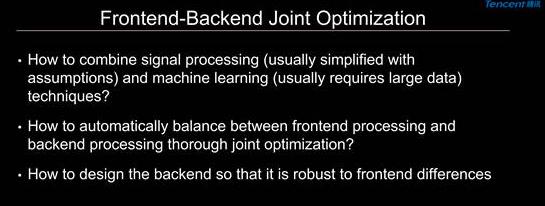 另外,我们有没有办法把前端的信号处理跟后端的语音识别引擎做更好的联合优化。因为前端信号处理有可能丢失信息,且不可在后端恢复。以前那种分别优化的策略可能对于前端来说是最优的,但是放在整个系统里就不是了。所以我们有没有办法做一个自动的系统,能够比较好地分配前后端的处理,使得前端可以有效提升信号质量但同时比较少地丢失信息,而把一些剩余的噪声留给更强大的后端来处理,从而提升整体性能。