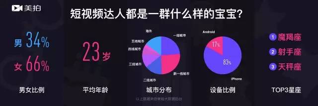 5月31日,美拍成立三周年生日会上发布的《短视频达人发展趋势报告》披露这一人群最新画像:平均年龄23岁、女性占比66%、接近一半来自一线和新一线城市,五分之四使用苹果手机。是的,他们比papi酱更年轻、更前沿。