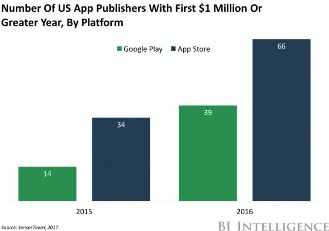 不过从增速上来看,Google Play的潜力也不错。2015年,百万美元俱乐部中只有14家Android应用开发者,2016年这一数字增长了近2倍。同期内百万美元俱乐部中苹果平台应用开发者由39家增长至66家,涨幅不足1倍。