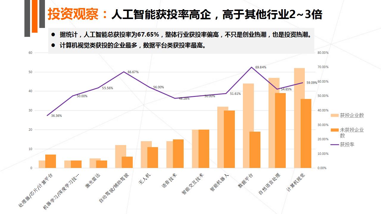 据统计,人工智能总获投率为 67.65%,整体行业获投率偏高,不只是创业热潮,也是投资热潮。计算机视觉类获投的企业最多,数据平台类获投率最高。