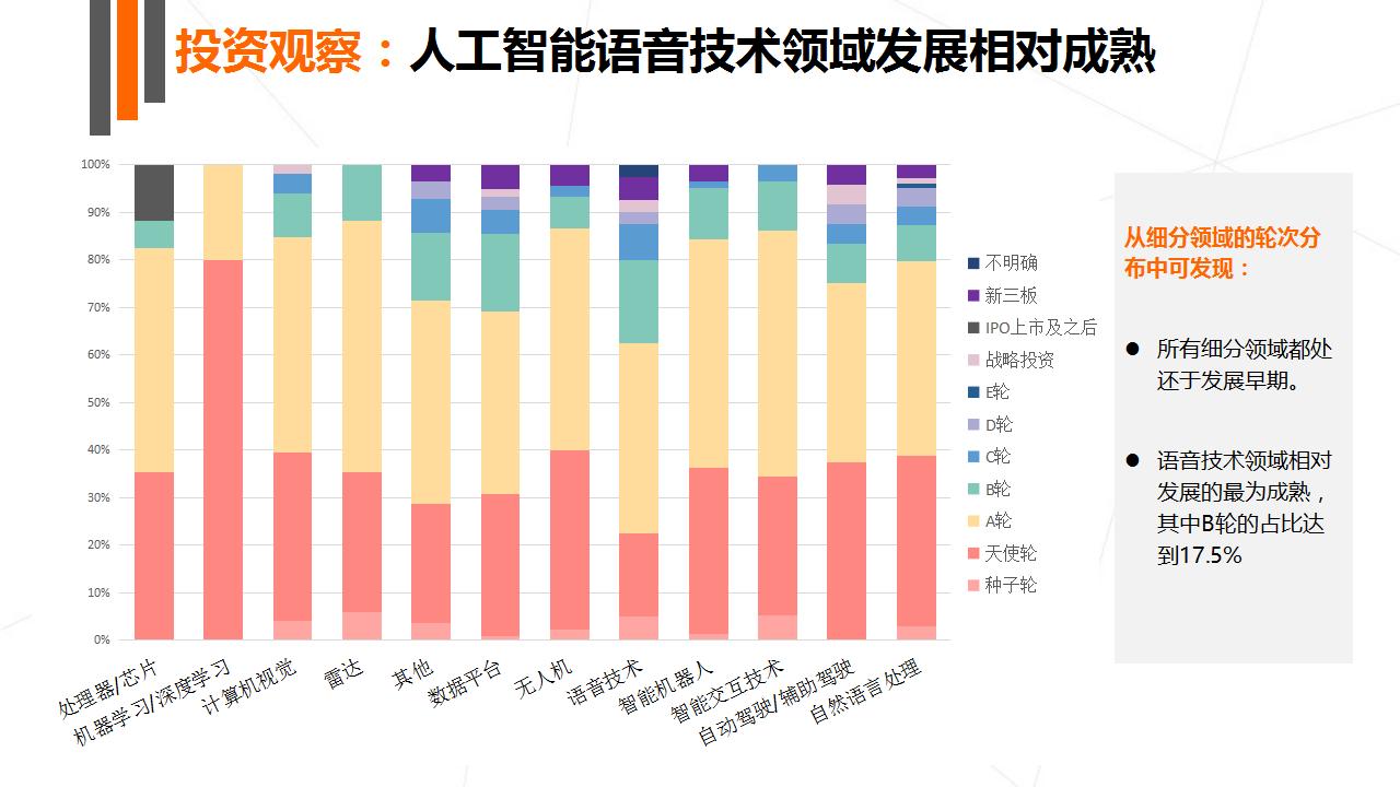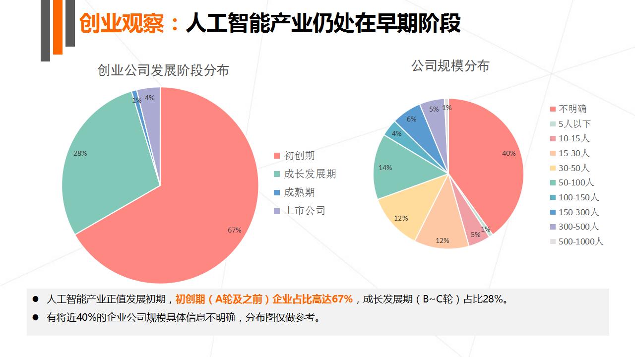 人工智能 80% 的投资事件都属于早起(A 轮及之前)。而投资金额在中后期(B 轮及之后)占比高达 65%。