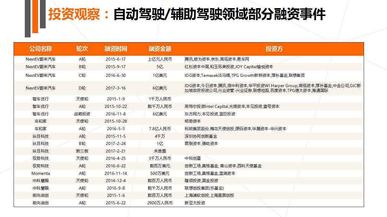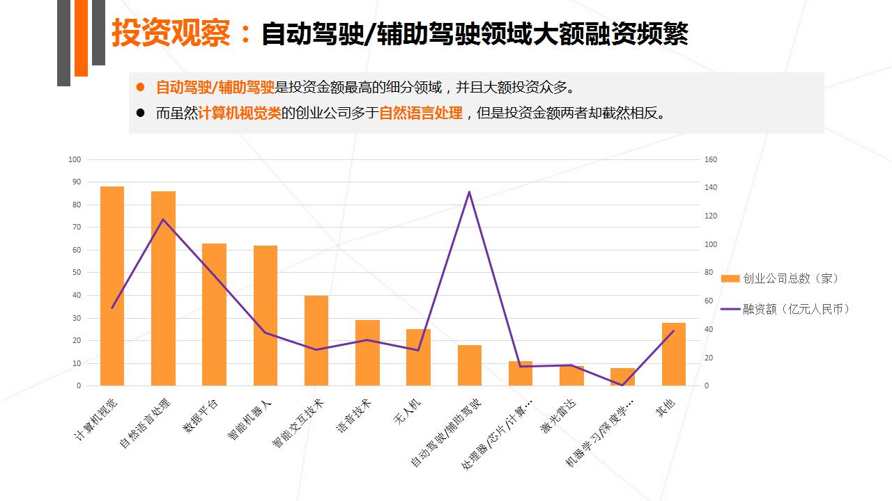 自动驾驶/辅助驾驶是投资金额最高的子领域,并且大额投资众多。