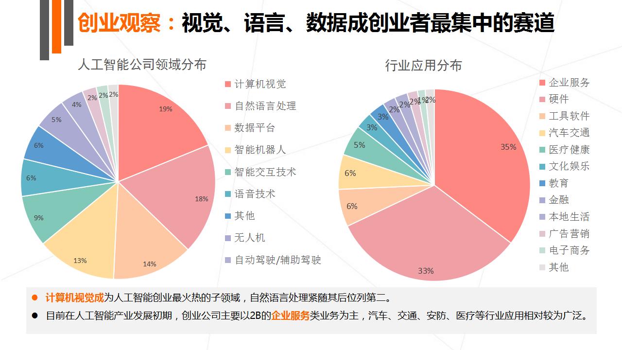 计算机视觉成为人工智能创业最火热的子领域,该子领域创业公司数量将近 90 家,自然语言处理紧随其后位列第二。目前人工智能处于产业发展初期,创业公司主要以 2B 的企业服务类业务为主,汽车、交通、安防、医疗等行业应用相对较为广泛。