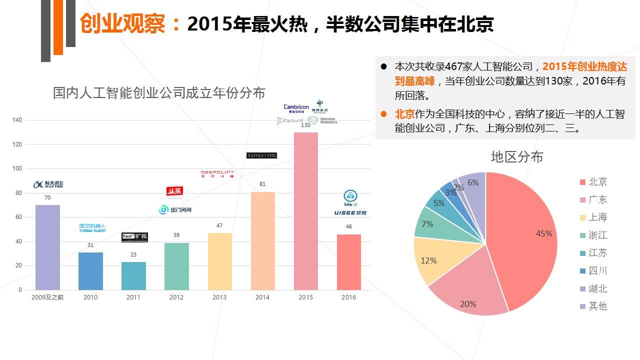 其中,2015 年人工智能创业热度最高,当年人工智能创业公司数量达到 130 家。