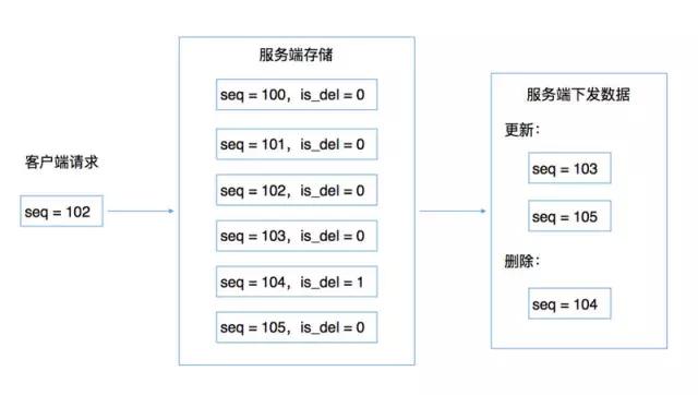 若客户端的传的 seq 过旧,增量数据可能很大。此时若一次性返回全部的更新数据,客户端请求的数据量会很大,时间会很长,成功率很低。针对这种场景,客户端和服务端需要约定阈值,若请求的更新数据总数超过这个阈值,服务端每次最多返回不超过该阈值的数据。若客户端发现服务端返回的数据数量等于阈值,则再次到服务端请求数据,直到服务端下发的数据数量小于阈值。