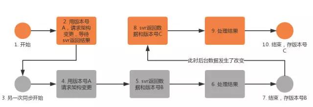 若同步架构时,后台下发了需要版本号回退的 flag,客户端将缓存和 db 中的所有节点标为待删除(时序图中 8,9 步)。