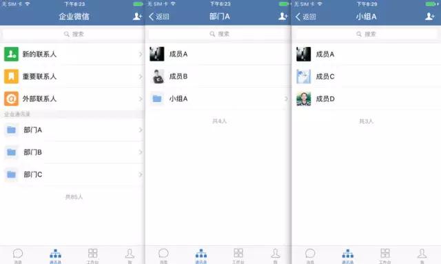 在企业微信中,组织架构是非常重要的模块,用户可以在首页的 tab 上选择"通讯录"查看到本公司的组织架构,并且可以通过"通讯录"找到本公司的所有成员,并与其发起会话或者视频语音通话。