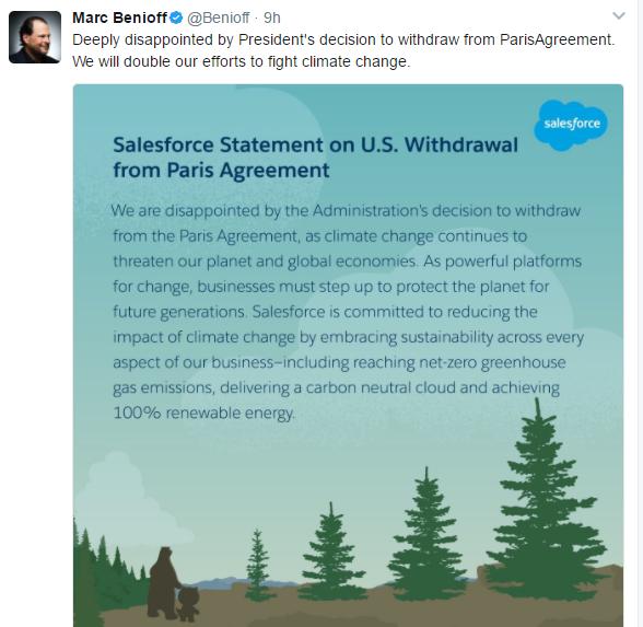 Salesforce CEO贝尼奥夫(Marc Benioff)也发推文表示失望,然后强调Salesforce会加倍努力与气候变化作斗争,继而疯狂地转发CBS关于此事的报道,还有马斯克的推文。