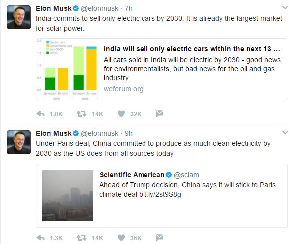 准确来说,马斯克是连续发了四条推文,宣布辞职后,他连发两条关于中国和印度支持《巴黎协定》的立场声明,嗯……还将中国和美国对比了一下。