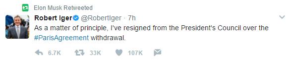 跟马斯克一样冲动的,还有迪士尼的CEO艾格(Robert Iger),他也将从总统商业顾问委员会辞职。