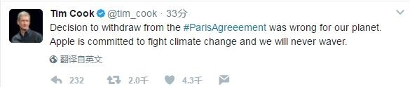 苹果CEO库克称,退出巴黎协定的决定对我们的地球来说是错误的。苹果承诺对抗气候变化,我们永不动摇。