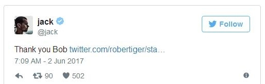 Twitter CEO多尔西(Jack Dorsey)则在下面点赞。
