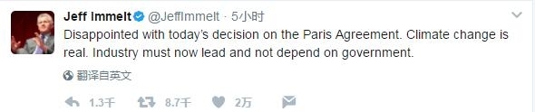 美国通用电气首席执行官伊梅尔特(Jeffrey Immelt)发推文说:“今天退出巴黎气候协议的决定令人失望。气候变化是真的。业界要承担起领导角色,不要再指望政府了。”