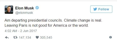 于是,特朗普宣布了退出之后,马斯克发推文称:“我要离开总统的顾问委员会了,气候变化正在真实发生,退出《巴黎协定》对美国或世界都不是好事。”