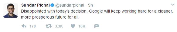 谷歌CEO桑达尔·皮查伊(Sundar Pichai)说,宝宝很失望,但谷歌未来会为了一个更清洁和繁荣和未来继续努力。