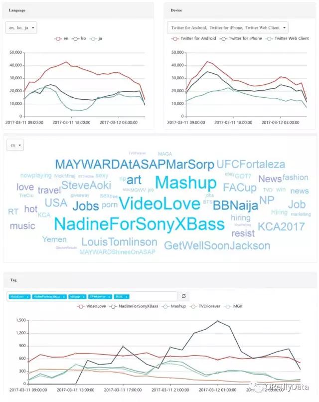 该演示按照语言和设备维度显示了Twitter消息的趋势。在图8中可以看到,美国白天的英文消息量上升,而亚洲语言的消息量在夜间下降。演示里还有一个标签云,用以显示最新的热门话题。在标签云下面是最热门标签的趋势。所有图表都是实时到最近五分钟。