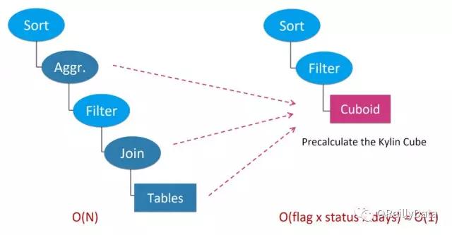 Kylin的解决方法是预计算。整体思路是,如果我们提前知道查询的模式,我们就能预先计算出整个执行的一部分。在上面这个例子里,就是预先计算Aggregate、Join和表扫描操作。生成的结果是一个立方体理论里的数据立方(或者可以把它叫做“实例化的总结表”,如果这样听起来觉得更好的话)。