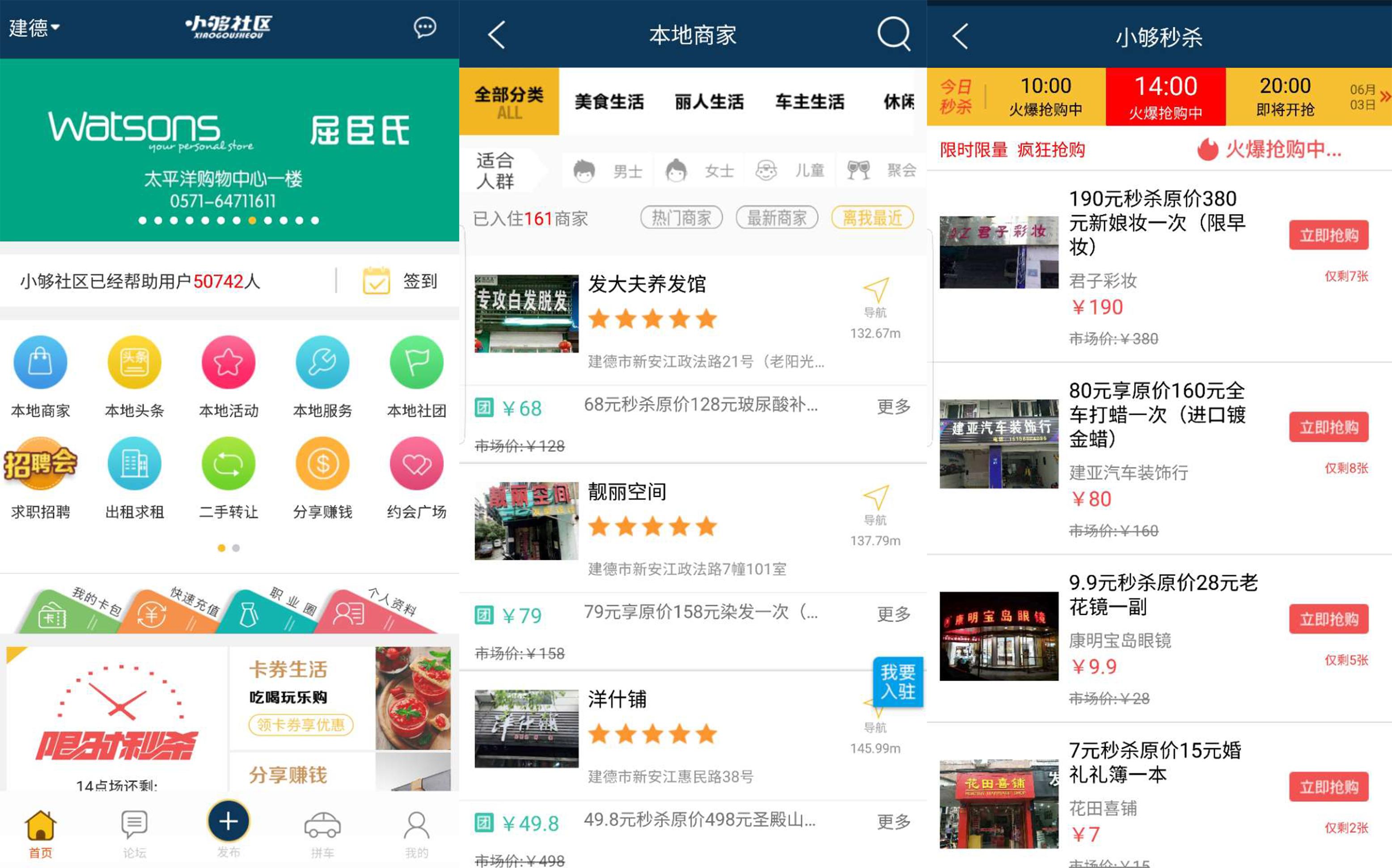 针对上述问题,小够社区围绕三四线城市的人们开展O2O服务,提供当地的信息交流和生活服务,包括拼车、房屋租赁、人才招聘、二手商品和点评外卖等常见的生活服务类功能。简单来看,小够社区就是美团、大众点评、滴滴、58同城等三四线城市的简化集合版,以解决各类信息交流平台都是空白的问题。