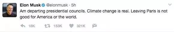 我将离开总统顾问委员会,气候变化是真实的,退出巴黎协定对美国和世界都是不利的。