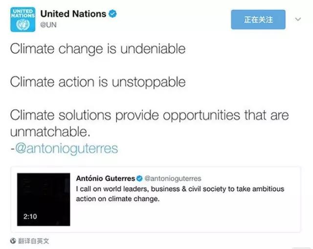 联合国官方账号发布推特,转发联合国秘书长古特雷斯(António Guterres)5月30日的呼吁:“各国领导人、商业和民间社会一起采取行动,来应对气候变化。”并再发呼声:“气候变化不可否认,应对行动势不可当,应对方案将提供无可匹敌的机会。”