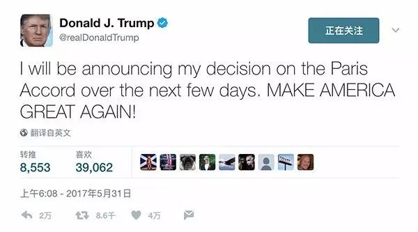特朗普在推特上预告将退出巴黎协定,并称会“让美国再次变得伟大”
