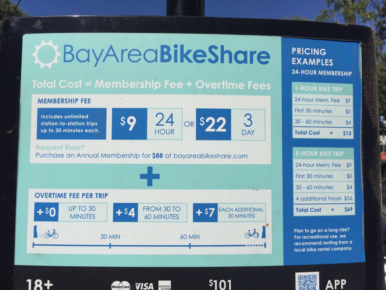 在自行车停靠的地方,也直接标示了价格,一天9美元,3天22美元,同时还有梯形价格表,直接刷信用卡就可以租用: