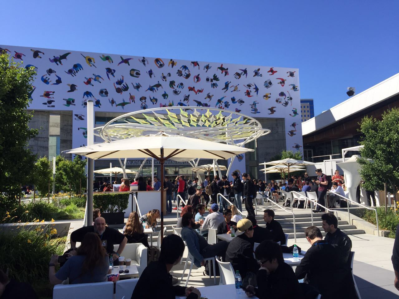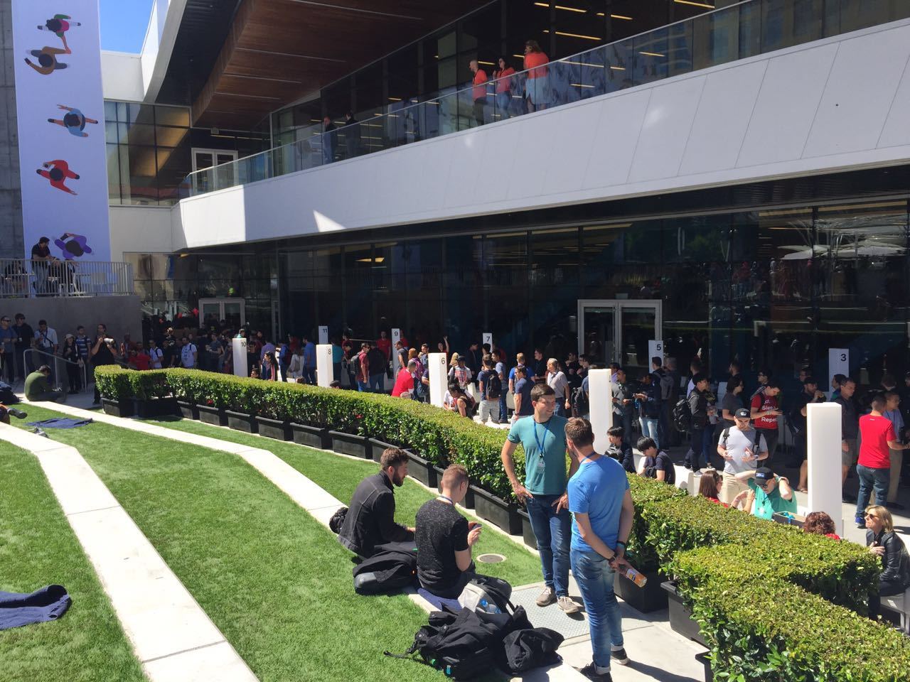 于是,快速办理入住,迫不及待赶往现场,由于住的酒店和McEnery会议中心紧挨着,下楼右转即到。然而,还没走到正门,就远远看到人潮涌动,原来是开发者们在排队领取明天的入场证件。
