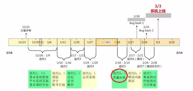在紧急项目A中,我们在计划里做了两层的缓冲设置。首先将整个产品一期开发分成了7个迭代,平均每个迭代5-10个工作日。第一层缓冲留在了各个迭代内部,比例是20%-30%,主要目的用途在于承载需求蔓延以及全新系统的联调风险;第二层缓冲留在了第四个迭代之后,设置了一个缓冲迭代(见下图),用以承载可能的系统优化需求。这主要是因为产品是全新系统,在前期风险识别时,认为对全新系统的需求分析和策划交互很难一步到位,需要留有调整优化的空间。这其实本身就是一项风险应对的措施。