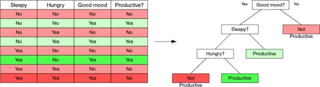 考虑下图中的示例。在这个数据集中,我可以基于三个因素观察到某人是否有生产力。使用一个决策树学习算法,我可以通过一个指标来识别属性(其中一个例子是信息增益)。在这个例子中,心情(mood)是生产力的主要影响因素,所以我根据 Good Mood 一项是 Yes 或 No 而对这个数据集进行了分割。但是,在 Yes 这边,还需要我根据其它两个属性再次对该数据集进行切分。表中不同的颜色对应右侧中不同颜色的叶节点。